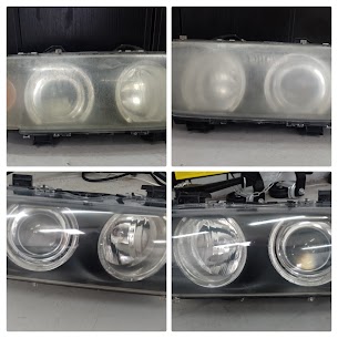 The headlight restoration process starts with cleaning the headlights then wet sanding with various levels of abrasive sandpaper.