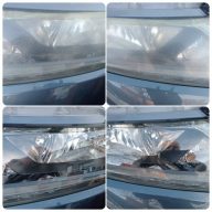 The headlight restoration process starts with cleaning the headlights then wet sanding with various levels of abrasive sandpaper.
